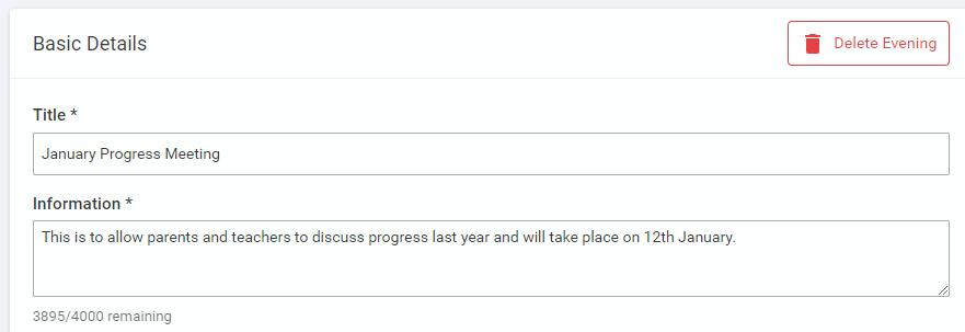 Note that the text at the top contains what you entered in Configure Evening > Basic Details: