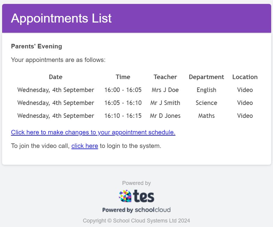 When their bookings are made (or edited) a parent receives a confirmation email. This is sent to the email address on their parent record. If they have no email address, no confirmation is sent.