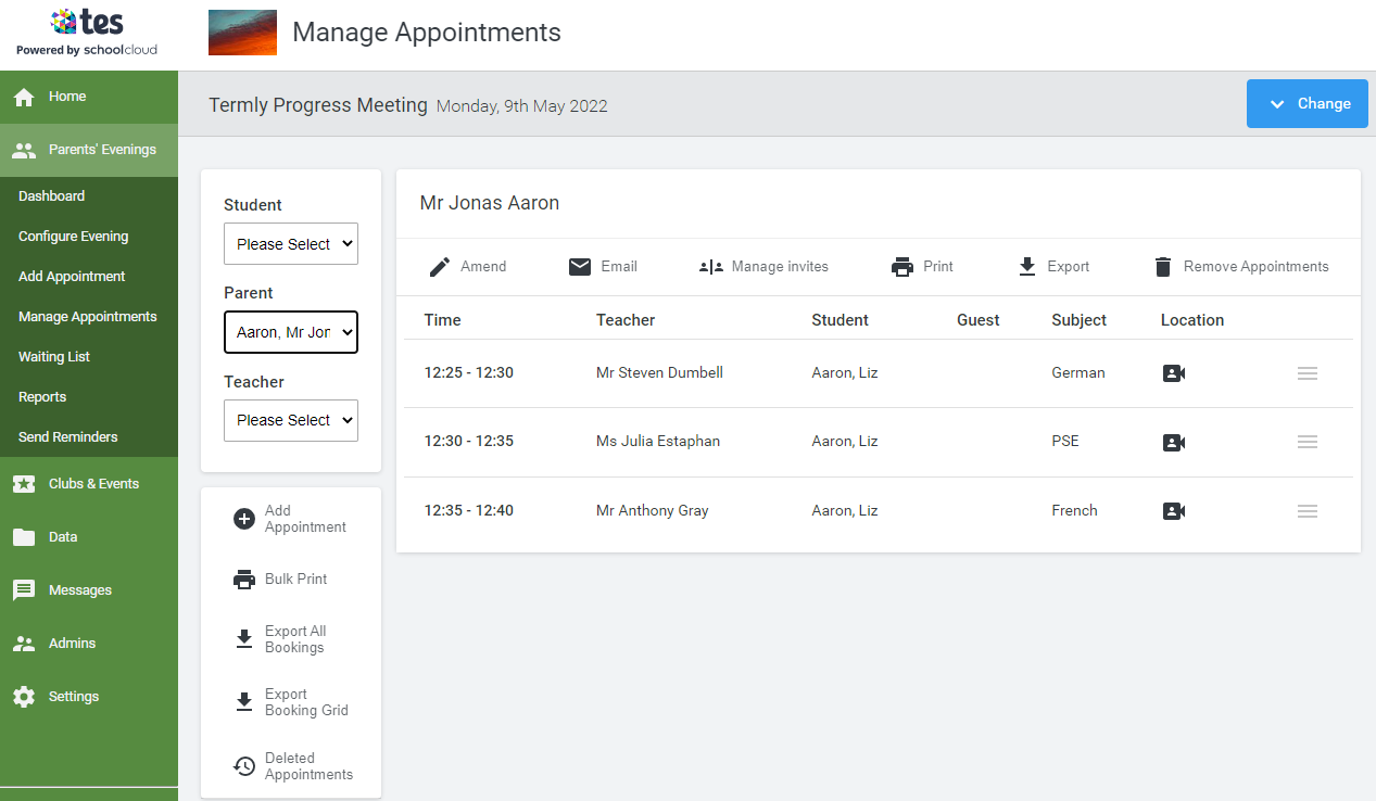 If you need to resend an individual parent's confirmation email, you can do so at any time by clicking the Email option at the top of that parent's appointment list in Manage Appointments: