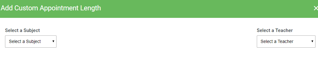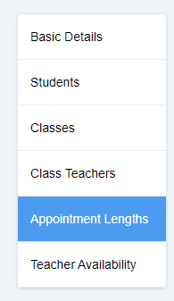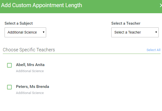 - The Add Custom Appointment Lengths button then allows you to add a different length to the standard length for a particular teacher or class/subject - this will always be a multiple of the standard lengths chosen.