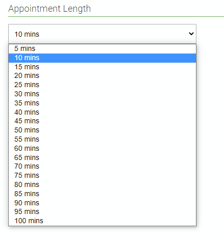 e.g. if you need a mix of 10 and 15 minute appointments you will need to set the default to 5 - even if you will not have any actual 5 minute appointments.