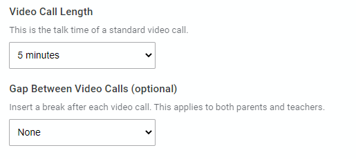 When an evening is being held by video call you can set the standard Video Call Length, as well as specify if there should be a Gap Between Video Calls (for both teachers and parents).