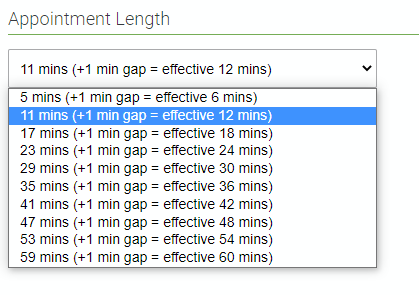 Note: If you are using Video Appointments and have added Gaps of one minute or more your Custom Appointment Lengths will be multiples of the standard length plus the gap - but only the number of minutes you chose for your gap will be used as a gap at the end of the appointment.