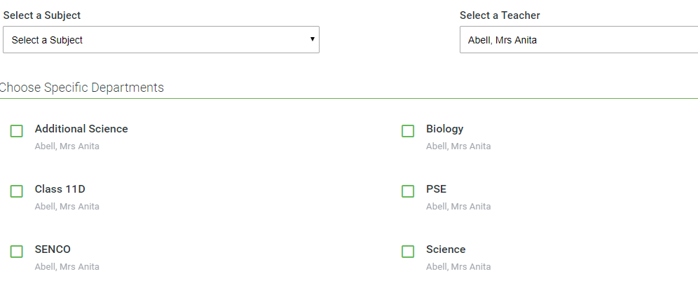 A list of all the subjects they are linked to will then appear. Tick the subjects for which that teacher will take different appointment lengths.