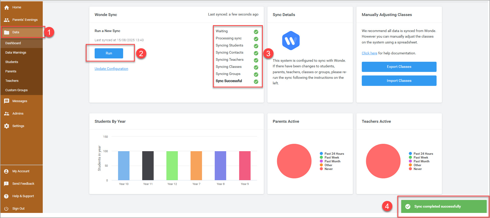 - Click on the button 'Run' to perform a sync and download the data from Wonde to Parents' Meetings Module. Once the sync is successfully completed, you will notice data that has been pulled from the Wonde and with green ticks. In the event of an error, please ensure that the relevant data has been properly enabled for import into the Parents’ Meetings module in Wonde portal, as missing or restricted data may prevent successful synchronisation.