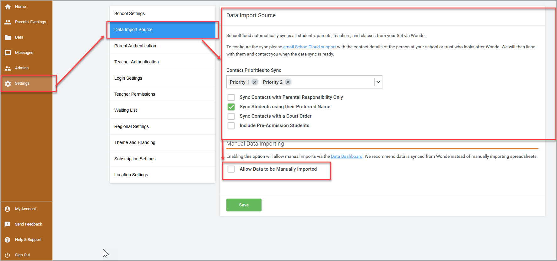 School can check the Wonde setup by going to Settings > Data Import Source , You will see pre-selected options such as your contact priority and other options around your preferences on syncing the contacts.